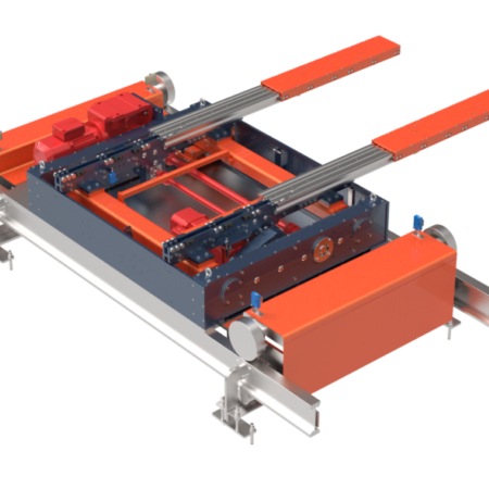 These “intelligent” trolleys run on an electrified rail and companies employ them widely as the main aisle to transport pallet, boxes or similar load units.