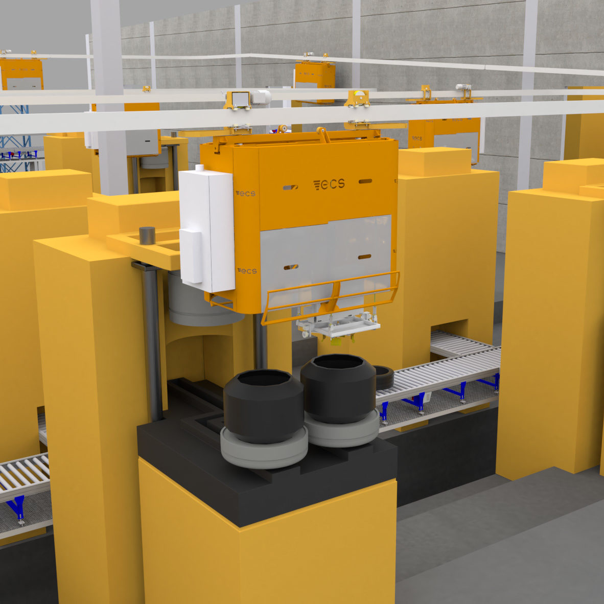 These systems allow to automatically load and unload Green Tyres and consist of trolleys for overhead transport on an electrified rail. They are equipped with 1 or 2 lifting groups, tyre gripper with variable opening and safety devices that prevent pieces from falling. Once in position the trolley stops, open the safety device, the frame descends and drop off the tyre on the vulcanization press. Our trolleys can take advantage of 2-way switches to create bypasses, parking areas for energy saving or maintenance exits.