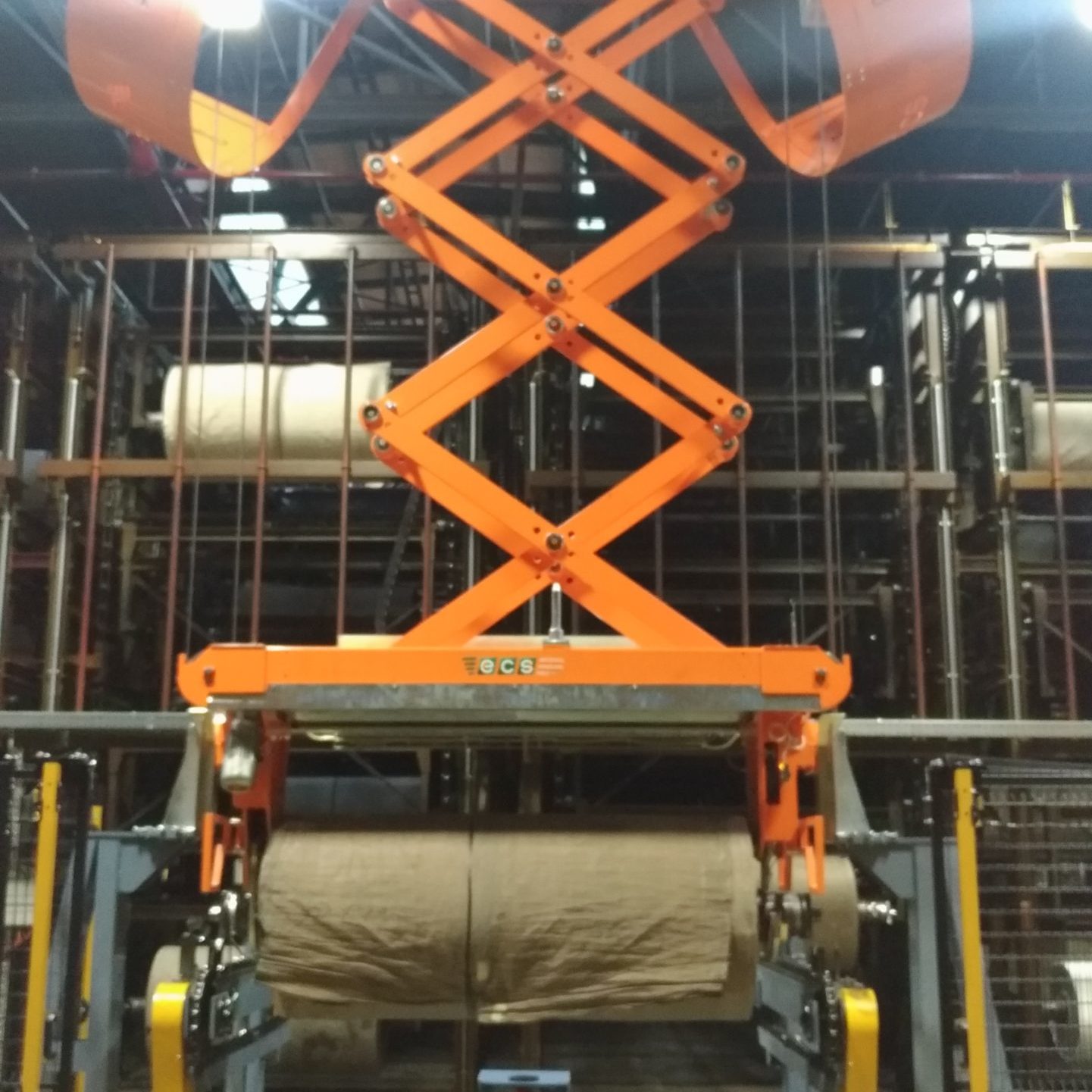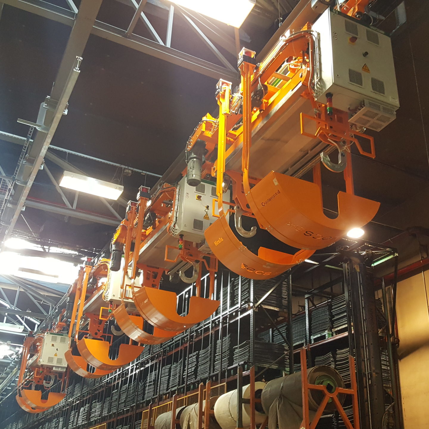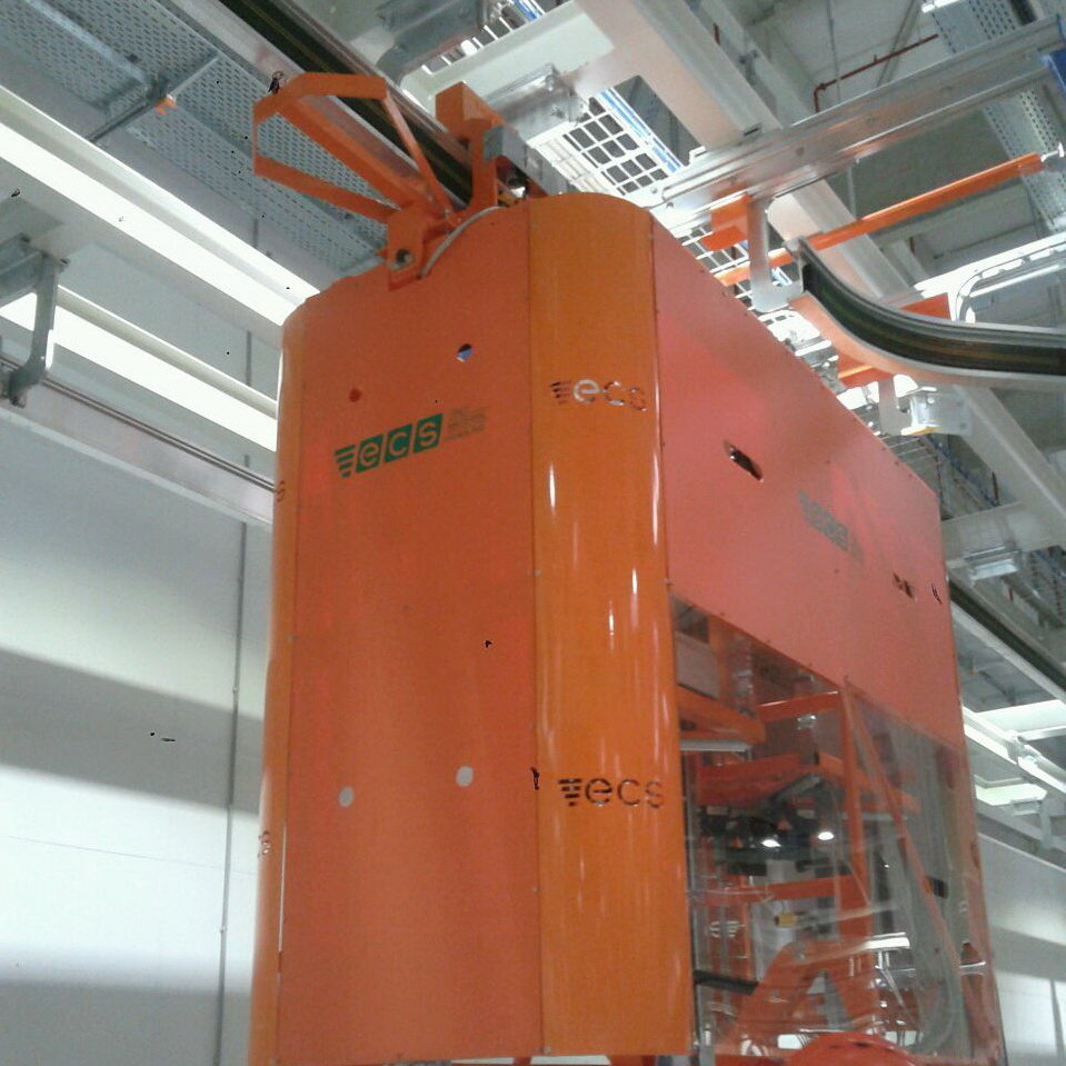 The RGV system transports autonomously rollers of raw and rubberized material from and to the warehouse. The overhead trolleys run along the circuit and they are equipped with a pantograph lifting system patented by ECS with two automatic gripping devices to handle the rolls.