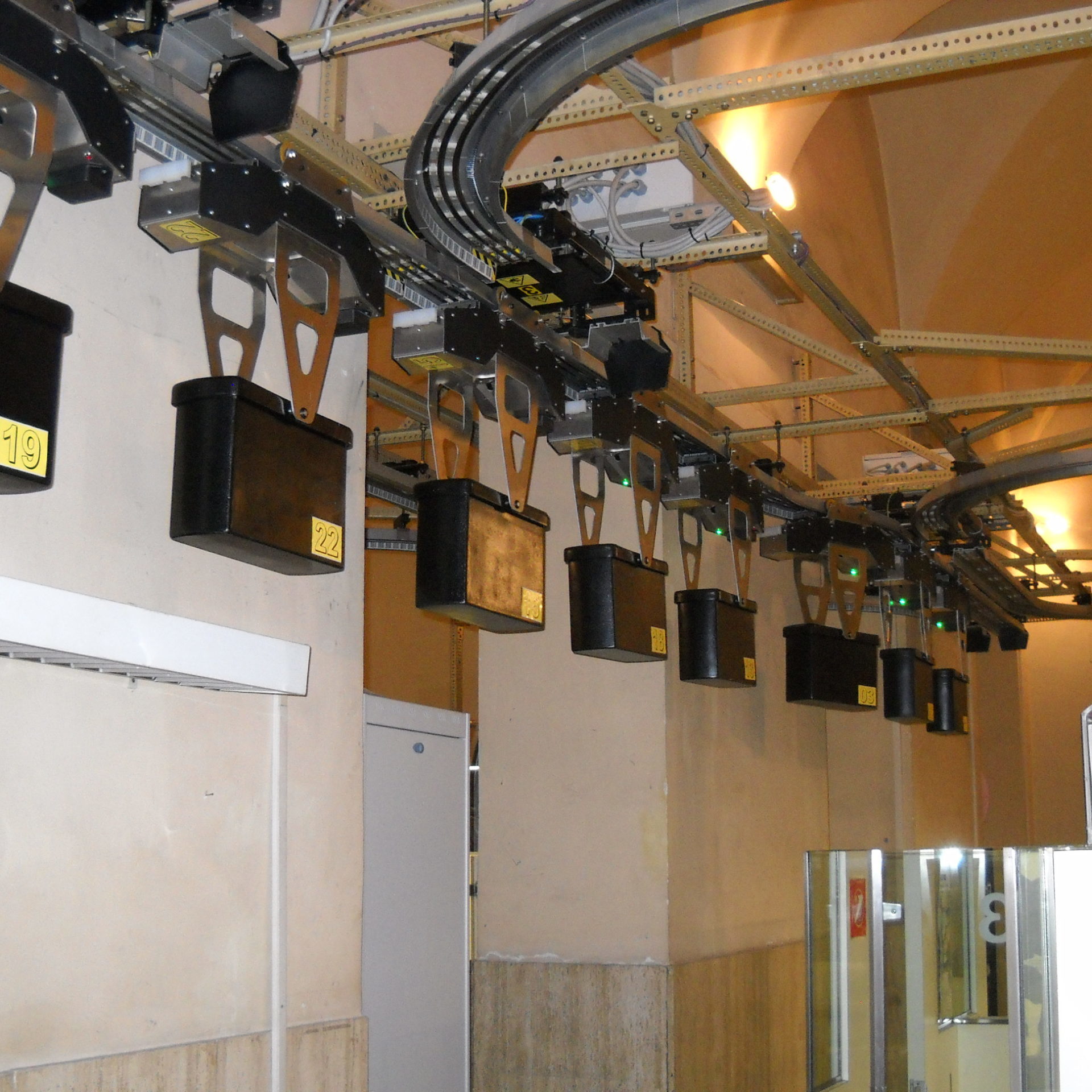 L’automotore per trasporto leggero funziona verticalmente e capovolto, all’interno di un edificio nuovo o preesistente e può trasportare carichi fino a 50kg. Il carrello è composto da una struttura in alluminio a cui possono essere fissati contenitori, ganci o dispositivi per applicazioni specifiche. Questo sistema trova applicazione in vari settori industriali, tra cui Banche, Ospedali, Poste, GDO, Tessile.