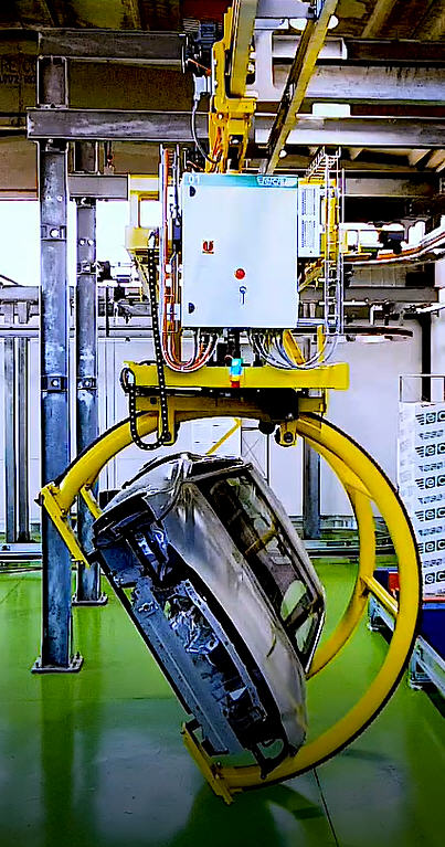 La versione “appesa” si distingue per le rotaie di guida disposte sopra il prodotto trasportato.